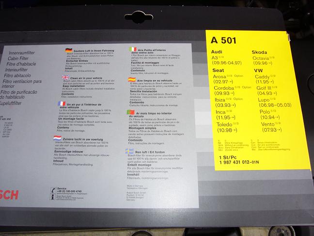 裏面には製品の特徴と適合車種が記載されています。わかりやすいイラスト付き説明書が付いていると書かれています。適合車種については、アウディ、セアト、シュコダ、VWとVWグループメーカー車種に共通の部品であることがわかりますね。