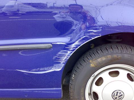 もうこの車を運転して10年以上経つのに、先日、不注意にも、地元の駅前某地下駐車場でこすってしまいました。写真はこすってしまった左後後輪付近。なんとも痛々しい姿であります。