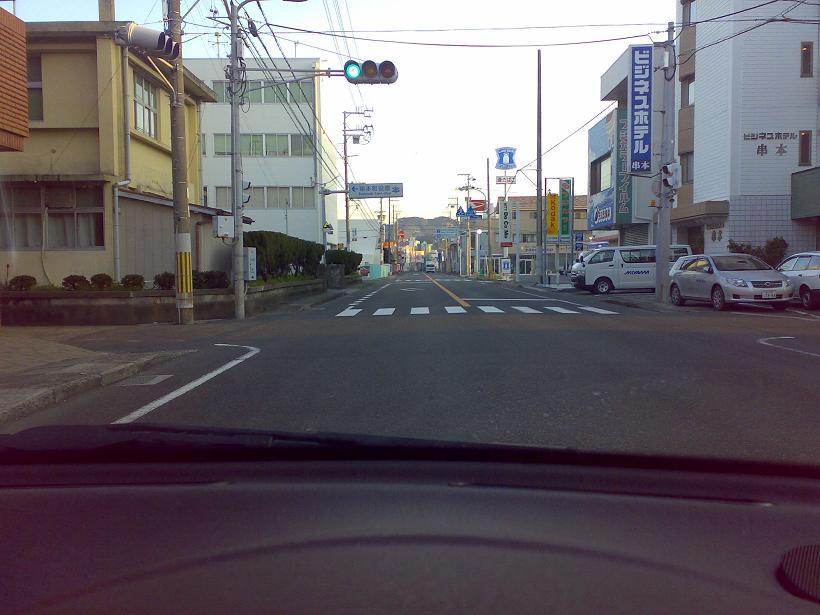 7:02 こちらは串本のメインストリート。この時間は人通りも少なく、平日としてはのんびり(?)。スーパーオークワ、コンビニ、ガソリンスタンドと、串本滞在中の必要なものは大抵こちらで入手可能。3度目の滞在となると、地理もだいぶ把握できて、居心地がよいですね。