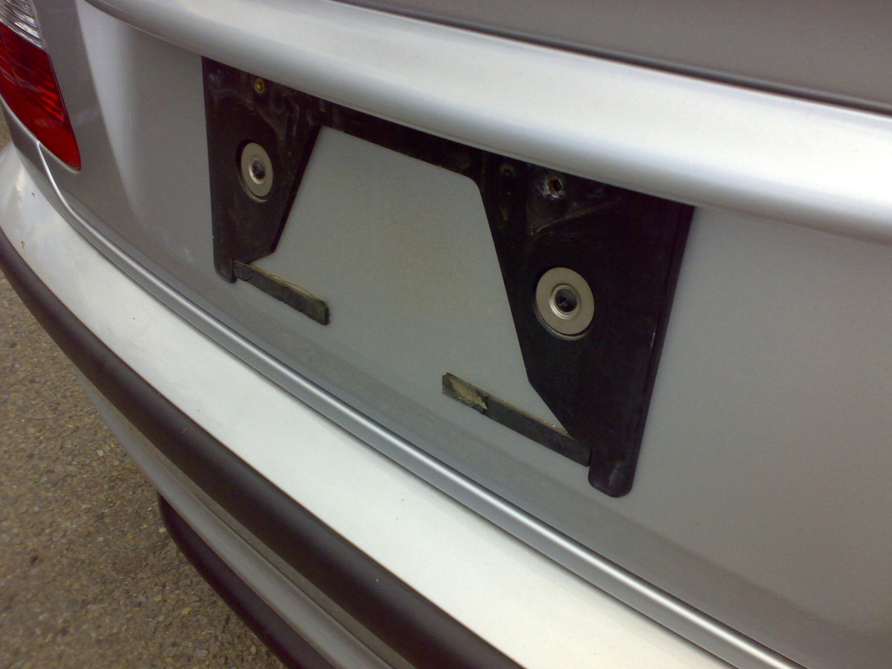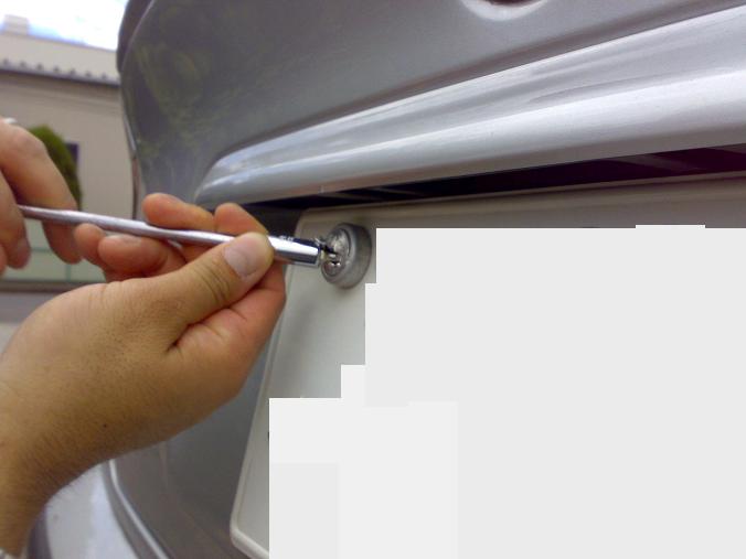 次に、この資料を持って別棟へ。(陸運局敷地内の別棟へ移動します。)ここで書類を提出すると、旧ナンバープレートをはずして持ってくるように指示されます。なので、はずしているところがこれ。前はプラスドライバーで普通にはずせますが、後ろはアルミ製のふたでロックがかかってるので、マイナスドライバーでこじ開けます。このとき、ネジはあとで使うので大事にとっておきましょう。