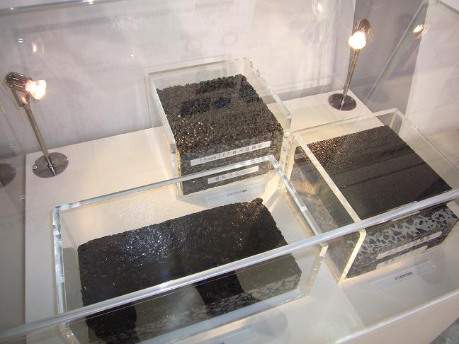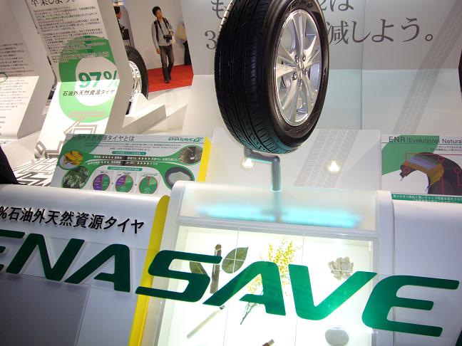 タイヤメーカーでもエコへの取り組みが盛んです。主なものは、材質の工夫による転がり抵抗軽減です。これは現在でもエコタイヤに利用されている技術。これから増えつつあるのが、ゴムの材質に石油外天然資源を利用するもの。ダンロップでは97%天然素材のタイヤをアピールしてました。写真右は廃タイヤ利用の一例。アスファルトとして利用します。