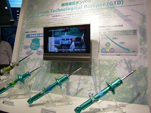 KYBのブースではエコダンパーを展示。ダンパーは、車のバネの中にある部品で、中にオイルが詰まっています。凸凹道を走った際に、バネだけだと縮んだ反動で伸びようとして、それが繰り返されてふわふわ落ち着かなくなりますが、ダンパーは、これらのふわふわ感を伸び縮みをする際のオイルの流動抵抗でもって、おさえます。
