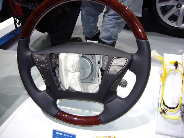 これは、ステアリング(ハンドル)の中が分かるカットモデル。白いのが折りたたまれているエアバッグ。衝突時に火薬で一気に膨らみます。できればお目にかかりたくないものですね。